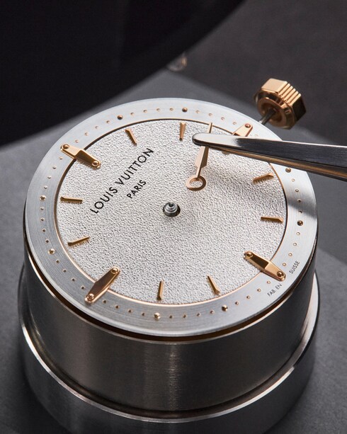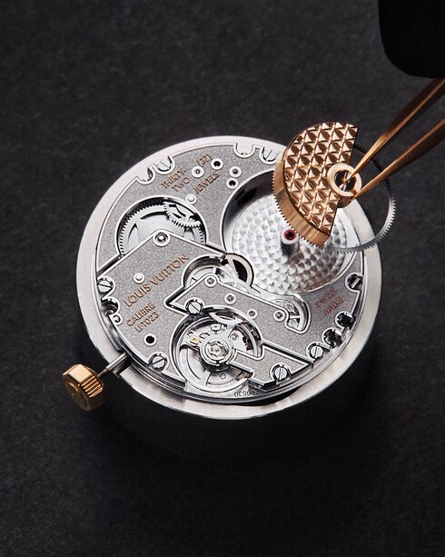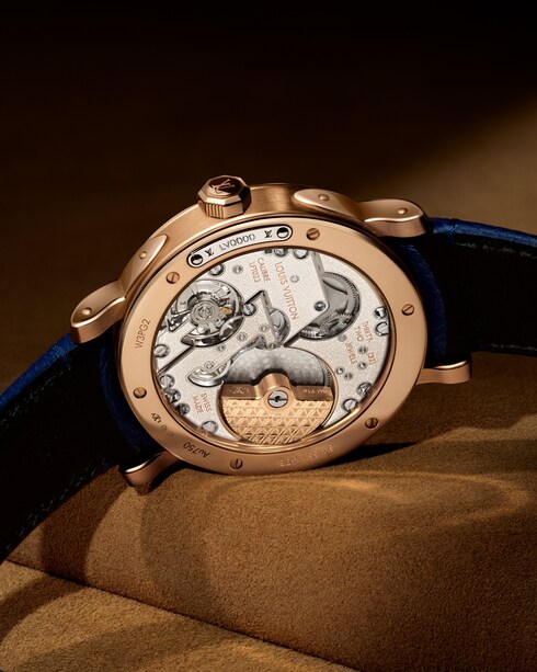 Rich in complexity, the dial is punctuated with gold indexes and studs, inspired by the metallic pieces and lozine nails of the emblematic Louis Vuitton trunks. Rendering exceptional visual texture, a grained finish center dial features on the rose gold variations of this re-envisioned timepiece – in an ode to Louis Vuitton's iconic Monogram canvas.