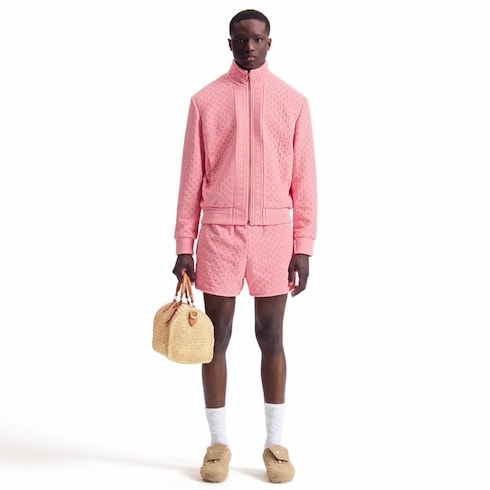 Tracksuit top berwarna pink muda ini terlihat memikat dalam bahan French terry. Desainnya menghadirkan jacquard motif LV Scarf dengan inspirasi dari seni Art Deco, yang menampilkan corak Monogram Flowers bertekstur, detail band bermotif LV, serta ornamen khas Rumah Mode lainnya. Atasan ini dapat dipadukan dengan celana pendek yang serasi untuk menyajikan kesan unik saat bersantai di tepi kolam renang.