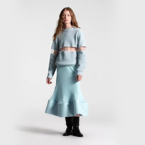 Midi skirt memikat ini terinspirasi tema mermaid dari tampilan runway. Terbuat dari bahan silk georgette disertai lining, desain rok ini anggun dan menonjolkan lekuk pinggul. Sementara, permukaan hem dengan jacquard dihiasi aksen jahitan yang menghadirkan finishing berbentuk lipatan yang bertekstur. Ritsleting melengkapi setengah bagian belakang rok.