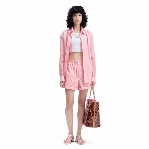 Kemeja berkancing yang klasik ini menyajikan sentuhan khas musim panas melalui detail yang memikat. Desainnya yang berbahan campuran katun dan sutra hadir dalam potongan lurus, sementara bagian lengannya yang transparan tampak kontras disertai motif Monogram yang dibuat dengan teknik fil coupé. Bagian kerah yang dilengkapi kancing mother-of-pearl dapat dilepas untuk tampilan lebih ramping, sedangkan bordir LV Initials ikonis menghiasi bagian dada.