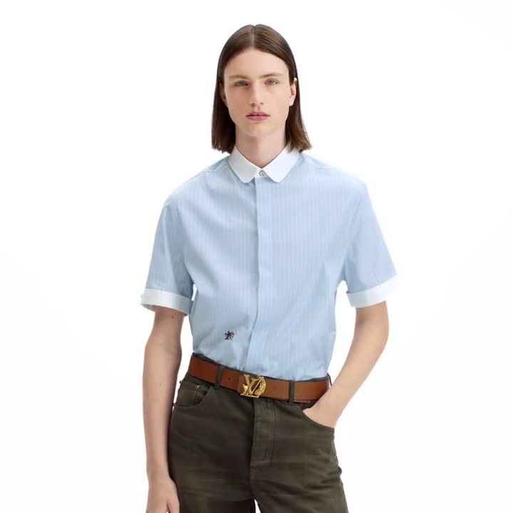 Kemeja lengan pendek ini, terbuat dari bahan katun poplin yang lembut, menampilkan motif garis berwarna biru muda yang elegan. Kerah dengan model bulat dan pergelangan tangan berwarna putih kontras sangat serasi dipadukan dengan jaket tanpa kerah dan kardigan dari koleksi musim ini. Detail bordir LV Fox signature yang ceria menghiasi bagian torso bawah sebelah kanan, selaras dengan sentuhan khas tema pedesaan Inggris pada koleksi ini.